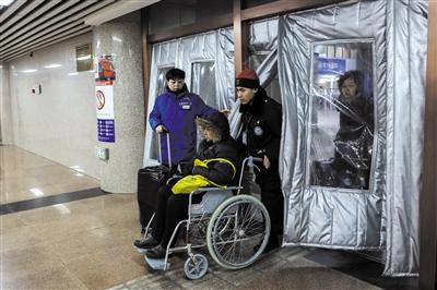 北京西站北一出口外,愛(ài)心扶助員用輪椅推著一位身體不適的老人去乘坐公交車。