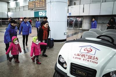 愛(ài)心扶助員幫助帶孩子的乘客乘坐愛(ài)心驛站電瓶車前往出租車等候區(qū)。