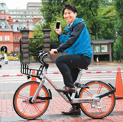 2017年8月22日,在日本北海道札幌市,一名當?shù)赜脩粼囼T摩拜單車。新華社記者 華義 攝