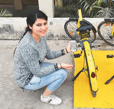 1月23日,在印度首都新德里一所學校,一名女生準備掃碼使用ofo“小黃車”。新華社記者 張迺杰 攝