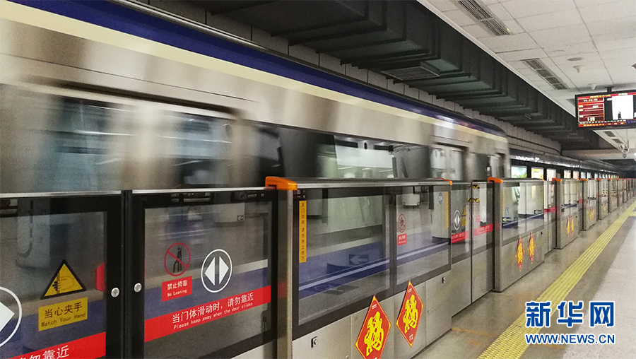 2018年2月15日,北京地鐵2號線屏蔽門上都貼上了“福”字,喜迎農(nóng)歷新年。新華網(wǎng) 張明宇 攝
