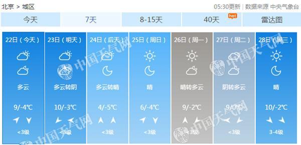 近日,京城暖意融融。預(yù)計,今明天(22-23日)最高氣溫可達10℃,但后天起,冷空氣“上崗”,屆時最高氣溫將下降6℃。氣溫多變,公眾勿急著換上春裝,仍需注意防寒保暖。