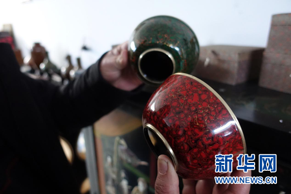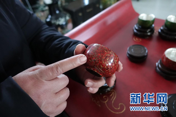 奚建輝介紹“菠蘿漆”技藝制成的茶碗。新華網(wǎng) 卓越 攝
