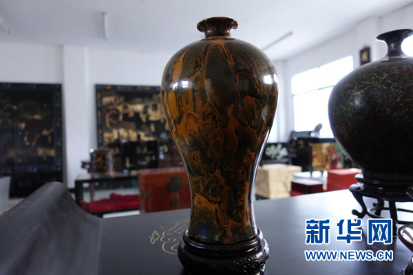 “流淌漆”技藝制作的花瓶?!傲魈势帷奔赐ㄟ^(guò)變換液態(tài)漆的濕度及流下的角度,使之形成自然的漆面花紋。新華網(wǎng) 卓越 攝