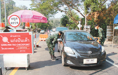在距離泰緬邊境約40公里的格班丹檢查站,幾名警察在細(xì)致地檢查一輛越野車,緝毒犬也跳上車子,把車輛內(nèi)外嗅了個(gè)遍。檢查站旁沙袋堆壘的掩體內(nèi),全副武裝的士兵警惕地注視著周邊茂密的叢林。