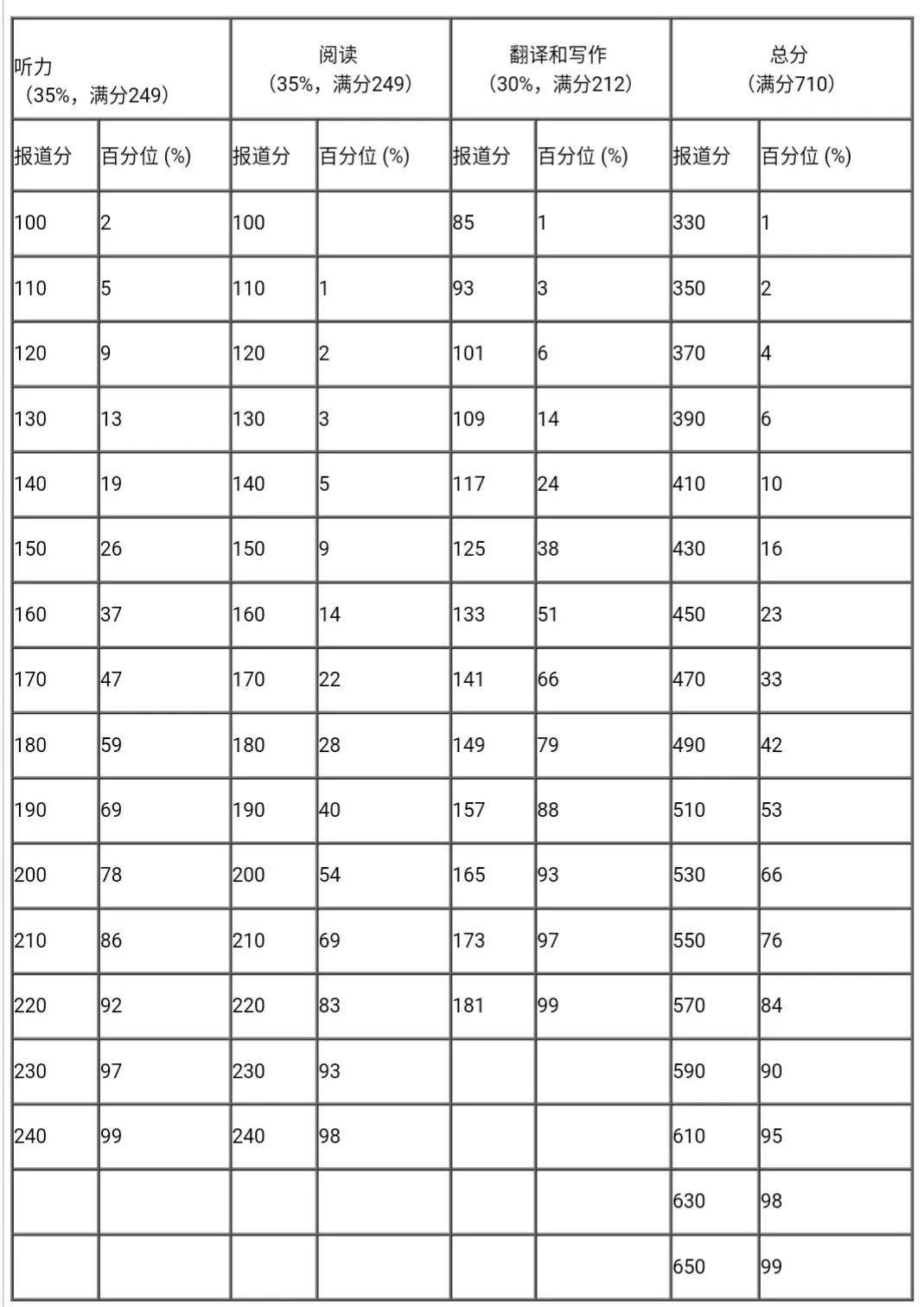 每次考試等值后的卷面分數(shù)都參照常模轉換為報道分。四、六級考試報道總分為710分,計算公式為: