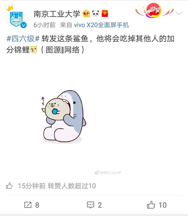 然而!南京工業(yè)大學官方微博不走尋常路,轉發(fā)鯊魚,吃掉其他人的錦鯉: