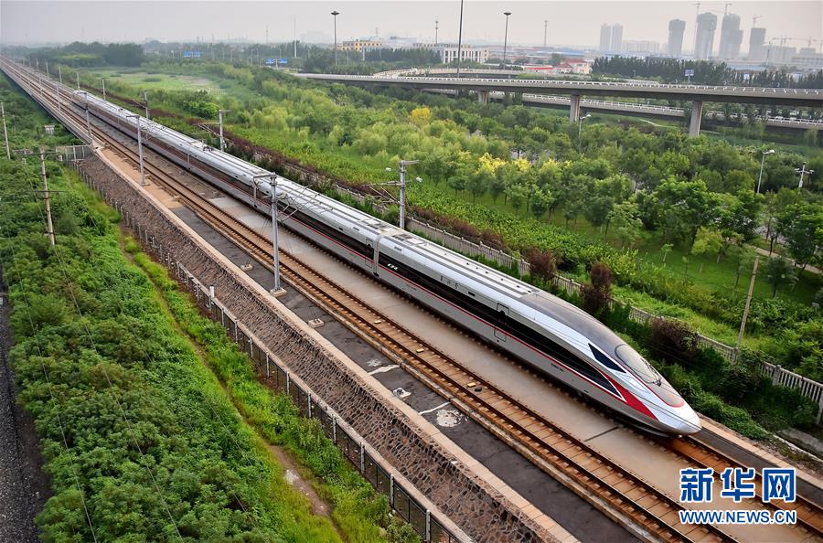 2017年8月21日,從北京南開往天津的C2001次“復興號”中國標準動車組駛入天津市區(qū)。自當日起,鐵路部門擴大“復興號”動車組列車開行范圍,京津城際列車開行19.5對“復興號”動車組列車。新華社發(fā)(楊寶森 攝)