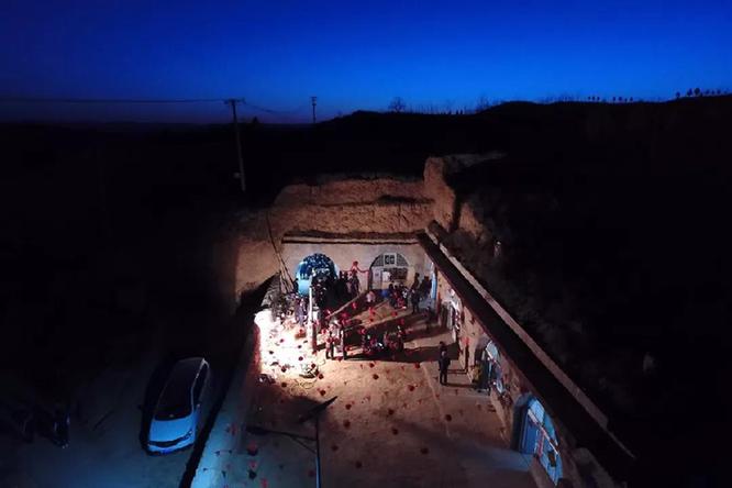 2月22日,在山西省永和縣奇奇里村,村民們?cè)跒轳T文忠的婚禮準(zhǔn)備菜品(無人機(jī)拍攝)新華社記者 詹彥 攝