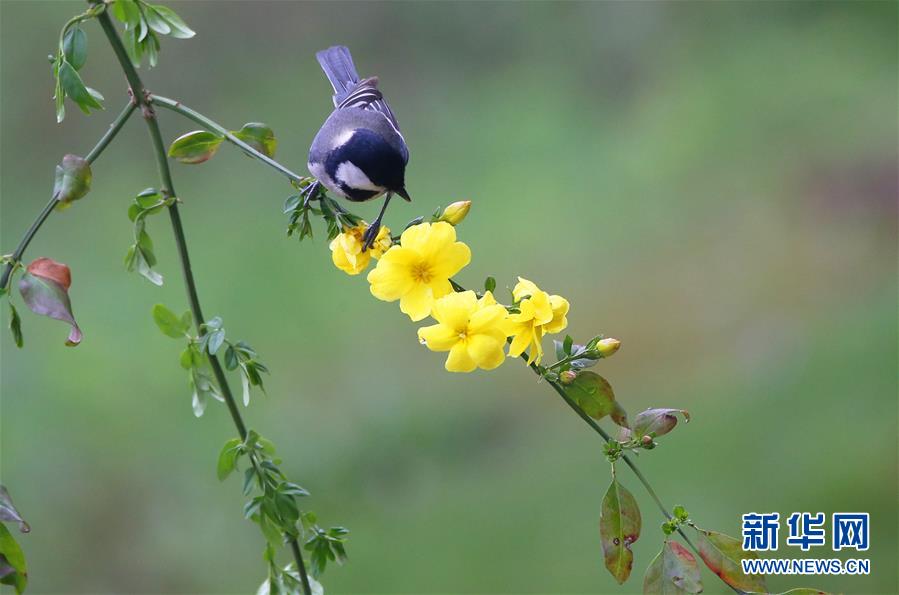 3月14日,在湖南省衡陽市生態(tài)公園,一只小鳥停留在花枝上。新華社發(fā)(曹正平 攝)