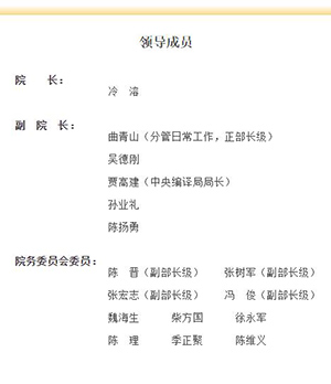 此外,擔(dān)任副院長的有曲青山(分管日常工作,正部長級(jí))、吳德剛、賈高建(中央編譯局局長)、孫業(yè)禮、陳揚(yáng)勇,院務(wù)委員會(huì)委員分別有陳晉(副部長級(jí))、張樹軍(副部長級(jí))、張宏志(副部長級(jí))、馮?。ǜ辈块L級(jí))、魏海生、柴方國、徐永軍、陳理、季正聚、陳維義。