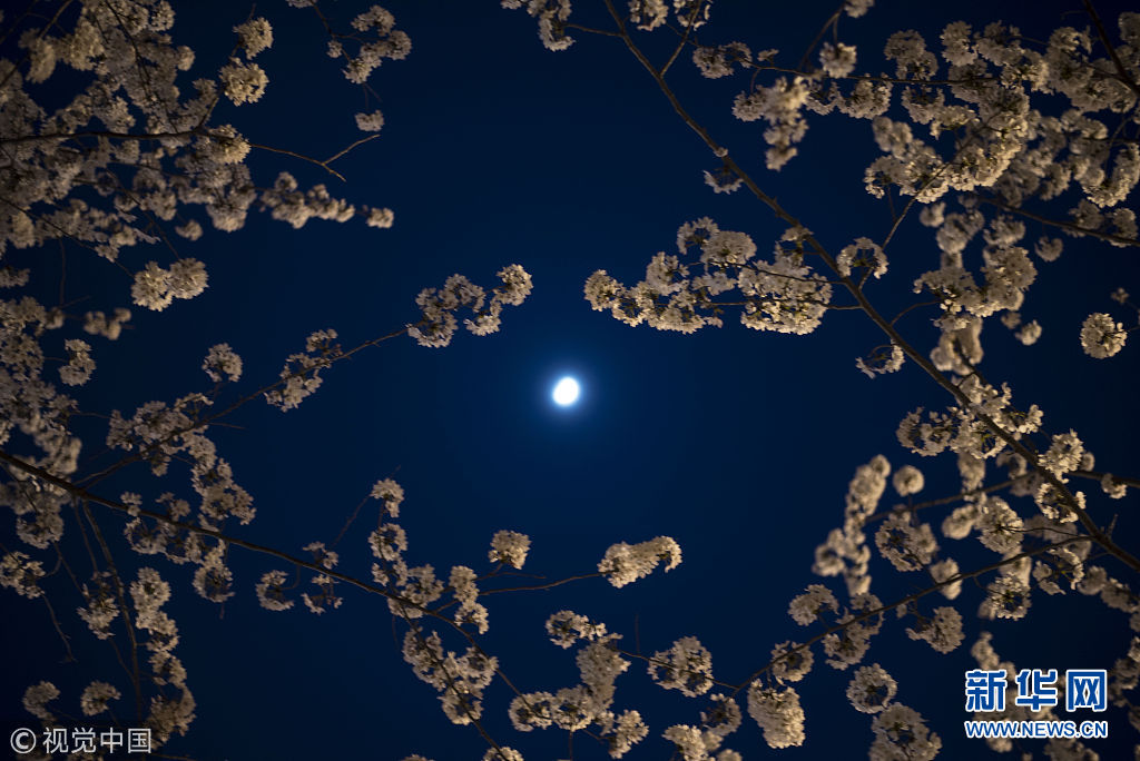 3月25日,揚(yáng)州鑒真大道,夜幕下的櫻花,在燈光月色的輝映下別有一番意境。(圖片來源:視覺中國)