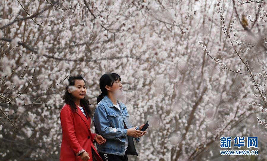3月28日,游客在敦煌鳴沙山下的李廣杏園內(nèi)賞花。近日,甘肅省敦煌市鳴沙山下8000多畝李廣杏花競(jìng)相開(kāi)放,吸引了眾多游客和市民踏青賞花。 新華社記者陳斌攝