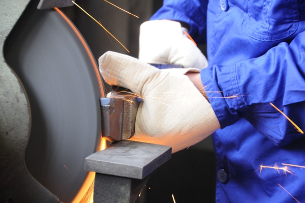 龍小平為記者現(xiàn)場(chǎng)演示車工最基礎(chǔ)的一道工序——磨刀。新華網(wǎng) 聶晨靜 攝
