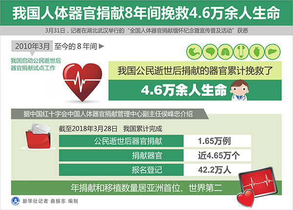 新華社武漢4月1日電(記者馮國(guó)棟)記者31日在湖北武漢舉行的“全國(guó)人體器官捐獻(xiàn)緬懷紀(jì)念暨宣傳普及活動(dòng)”獲悉,2010年3月我國(guó)啟動(dòng)公民逝世后器官捐獻(xiàn)試點(diǎn)工作至今的8年間,我國(guó)公民逝世后捐獻(xiàn)的器官累計(jì)挽救了4.6萬余人生命。