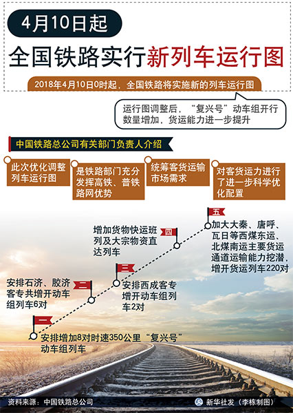 新華社北京4月2日電(記者齊中熙)記者從中國鐵路總公司獲悉,2018年4月10日0時(shí)起,全國鐵路將實(shí)施新的列車運(yùn)行圖。運(yùn)行圖調(diào)整后,“復(fù)興號(hào)”動(dòng)車組開行數(shù)量增加,貨運(yùn)能力進(jìn)一步提升。