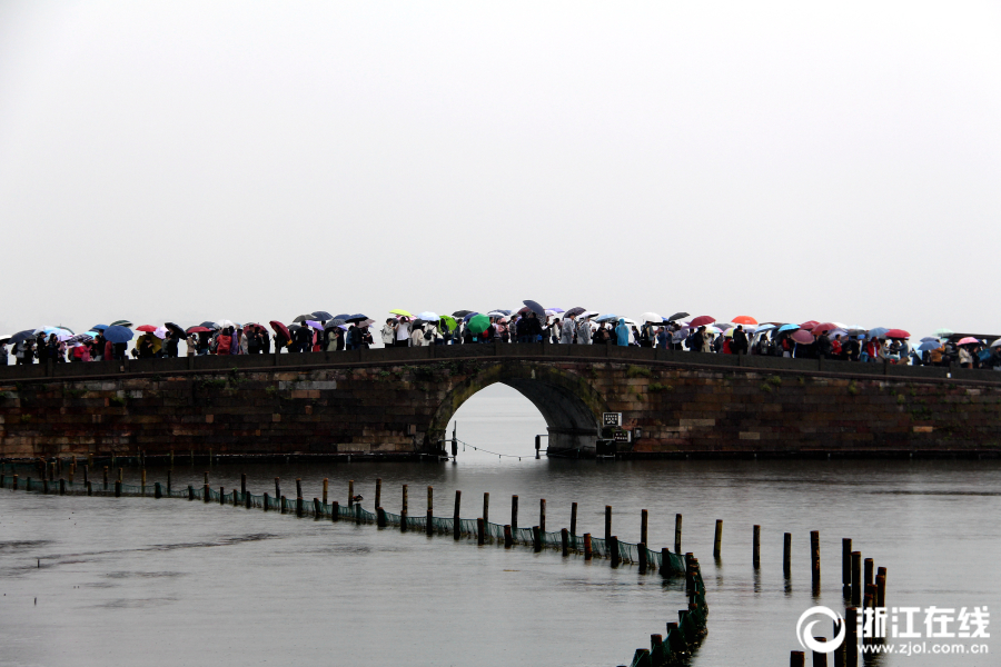 4月5日,清明小長假首日,杭州細雨綿綿,西湖景區(qū)游客絡繹不絕。杭城雖降雨降溫,但西湖景區(qū)前來賞花踏青的游客如潮,斷橋似人橋。(浙江在線拍友 里爾 柱子 攝)