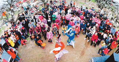 4月7日,安徽碭山縣迎來(lái)百萬(wàn)畝梨花盛開(kāi),當(dāng)?shù)乩孓r(nóng)組織吹嗩吶、唱大戲、斗羊等傳統(tǒng)民俗表演,祈盼酥梨豐收。韓俊杰 王嫣 攝影報(bào)道