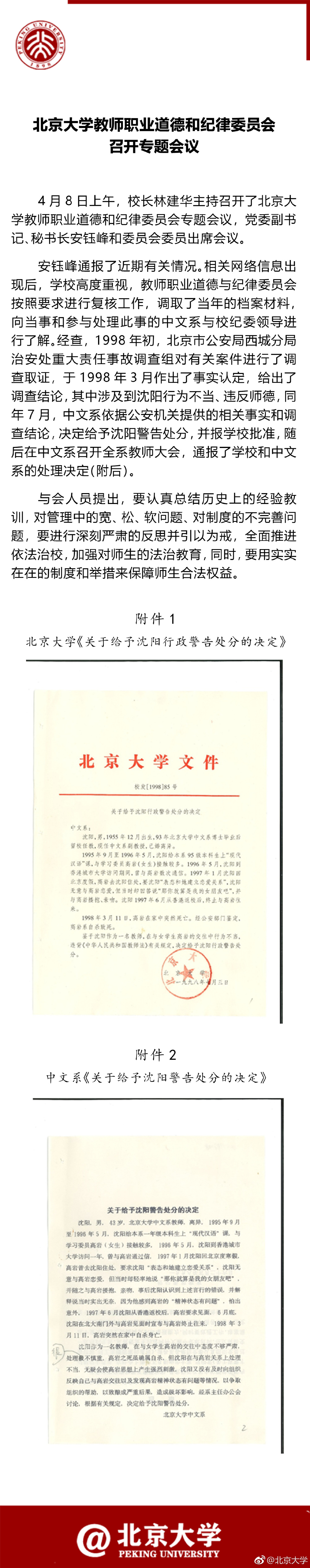 據(jù)北京大學(xué)官方微博消息,北京大學(xué)教師職業(yè)道德和紀(jì)律委員會(huì)今日召開專題會(huì)議 ,通報(bào)“沈陽(yáng)事件”,并出示了當(dāng)年對(duì)其警告處分的決定。