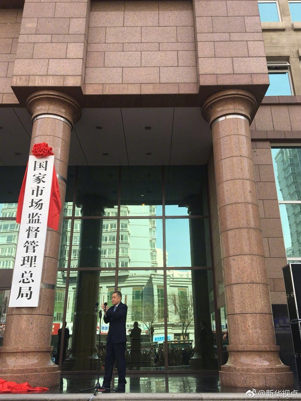 新華網(wǎng)北京4月10日電 ?新組建的國(guó)家市場(chǎng)監(jiān)督管理總局10日正式掛牌。張茅任局長(zhǎng)、畢井泉任黨組書記。(記者 趙文君) ????(據(jù)新華社“新華視點(diǎn)”微博)?