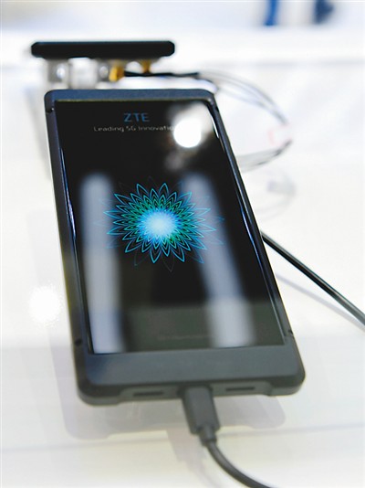 2018世界移動(dòng)通信大會(huì)上,“中國(guó)智造”成為全場(chǎng)一大亮點(diǎn)。圖為大會(huì)上拍攝的中興類5G手機(jī)。新華社記者 郭求達(dá) 攝