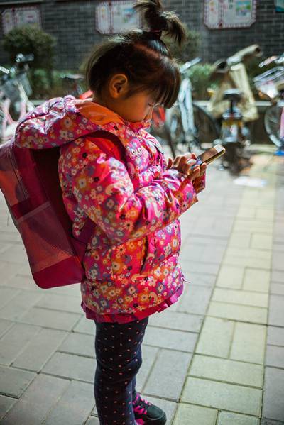 1月19日,在濟(jì)南實(shí)驗(yàn)初中校門外,一位和姑姑來等表姐放學(xué)的小女孩,背著幼兒園的小書包,站在那里低頭聚精會(huì)神地玩著姑姑的手機(jī)。