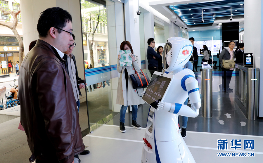 一位市民在位于上海九江路的無人銀行入口處向迎賓機(jī)器人說明需要辦理的業(yè)務(wù)種類(4月12日攝)。近日,中國(guó)建設(shè)銀行在上海九江路開出國(guó)內(nèi)首家無人銀行。新華社記者 方喆 攝