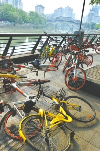 4月18日下午,華西都市報(bào)-封面新聞?dòng)浾唠S機(jī)選擇了成都市區(qū)的一些點(diǎn)位探訪,發(fā)現(xiàn)有的單車騎行率較高的地鐵口,單車停放比較整齊,壞車也能及時(shí)得到修理和轉(zhuǎn)運(yùn)。但有的街道路面單車超量投放,停放的車輛侵占了人行道,同時(shí)有被“疊”放的現(xiàn)象。下午4點(diǎn)半,九眼橋橋頭,記者發(fā)現(xiàn)靠近濱河路的木質(zhì)棧道上,紅色、黃色的共享單車倒了一地,影響了行人的正常通行。在龍舟路南街的文化墻邊,約十幾輛共享單車橫七豎八地“躺”在一起,無(wú)法正常使用。而在三官堂,因?yàn)槁访嬉呀?jīng)停放不下,十幾輛共享單車被“堆”放在地面一排單車的“身上”,導(dǎo)致上下兩排單車都無(wú)法取用?!败囎訑[多了,騎走的人少,肯定就堵在這兒了嘛?!痹诰叛蹣蛞粠ж?fù)責(zé)打掃衛(wèi)生的張師傅介紹,這樣的情況還是比較常見(jiàn),他覺(jué)得是跟超量投放、轉(zhuǎn)運(yùn)不及時(shí)有關(guān)。