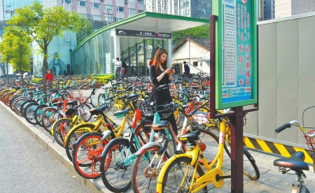部分路段超量投放 單車被“疊”放成上下兩排