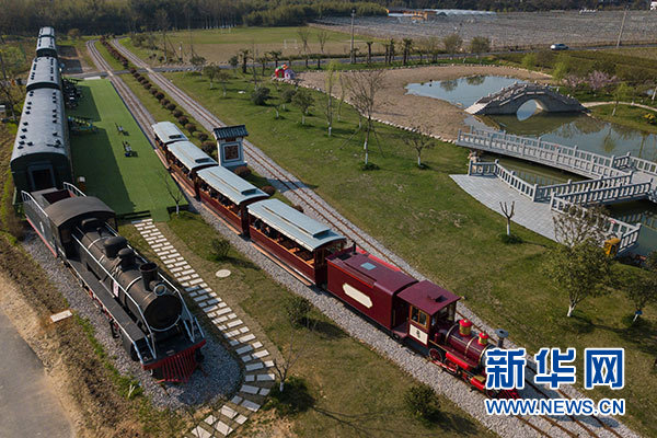 游客乘坐觀光小火車從浙江省安吉縣魯家村的休閑驛站邊駛過(3月23日無人機(jī)拍攝)。新華社記者 黃宗治 攝