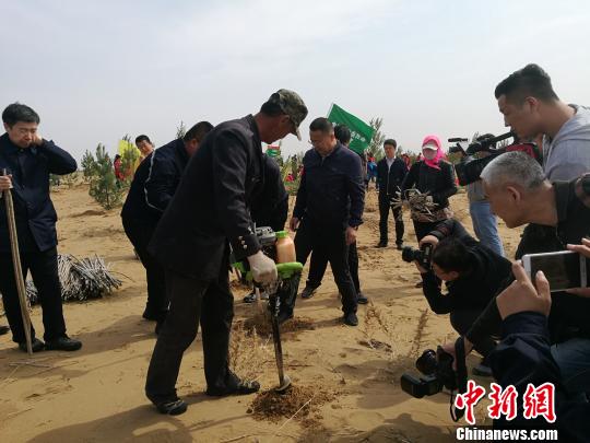 圖為在庫布其沙漠上舉行的“大型義務(wù)植樹活動”現(xiàn)場。李愛平 攝