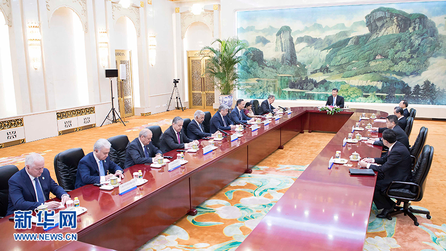 4月23日,國(guó)家主席習(xí)近平在北京人民大會(huì)堂集體會(huì)見(jiàn)來(lái)華出席上海合作組織成員國(guó)外長(zhǎng)理事會(huì)會(huì)議的俄羅斯外長(zhǎng)拉夫羅夫、印度外長(zhǎng)斯瓦拉杰、哈薩克斯坦外長(zhǎng)阿布德拉赫曼諾夫、吉爾吉斯斯坦外長(zhǎng)阿布德?tīng)栠_(dá)耶夫、巴基斯坦外長(zhǎng)阿西夫、塔吉克斯坦外長(zhǎng)阿斯洛夫、烏茲別克斯坦外長(zhǎng)卡米洛夫、上海合作組織秘書(shū)長(zhǎng)阿利莫夫、上海合作組織地區(qū)反恐怖機(jī)構(gòu)執(zhí)委會(huì)主任瑟索耶夫。新華社記者 李濤 攝