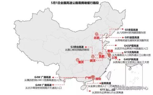 5月1日,全國高速路易擁堵緩行路段。來自交通部路網(wǎng)中心微信公號。