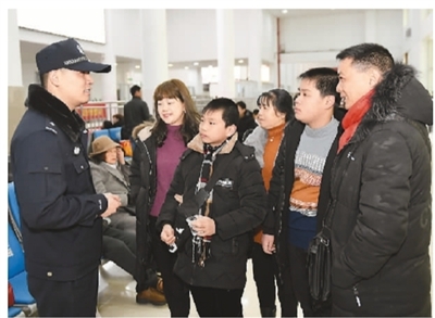 二月九日,民警在僑鄉(xiāng)浙江青田火車站為歸國返鄉(xiāng)華僑介紹乘車安全注意事項(xiàng)。新華社記者 黃宗治 攝