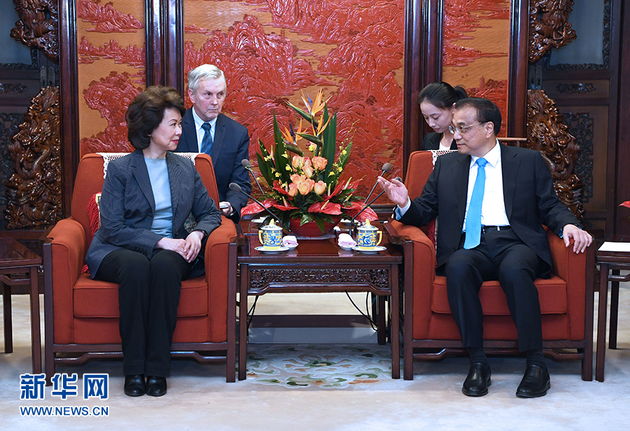 4月26日,國務(wù)院總理李克強(qiáng)在北京中南海紫光閣會(huì)見來華訪問并出席中美交通論壇第九次會(huì)議的美國運(yùn)輸部長趙小蘭。 新華社記者 饒愛民攝