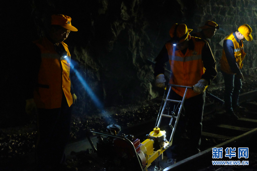鐵路職工在隧道作業(yè)。他們的工作被稱為“改道”,要把兩條鐵軌距離與標(biāo)準(zhǔn)數(shù)據(jù)的誤差控制在-2mm到+6mm之間。新華網(wǎng)陳俊松 攝