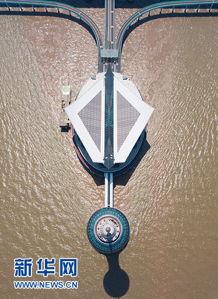 鳥瞰杭州灣跨海大橋海上觀光服務平臺(4月19日無人機航拍)。新華社記者 翁忻旸 攝