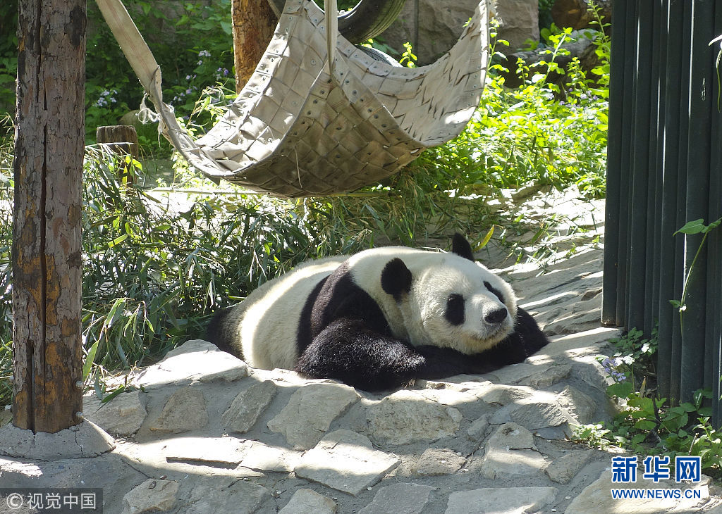 5月2日,在動物園內(nèi),熊貓曬著太陽,時不時伸個懶腰,翻個身,笨拙的動作盡顯萌態(tài)。(圖片來源:視覺中國)