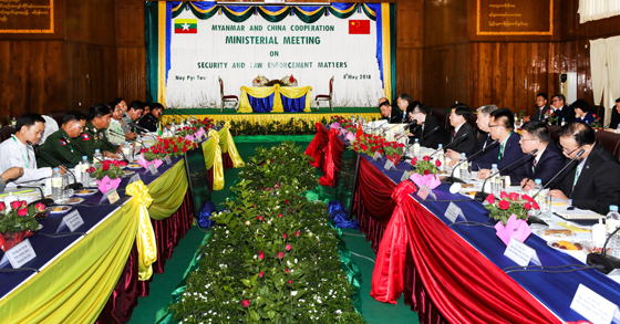 國務(wù)委員、公安部部長趙克志5月8日在內(nèi)比都與緬甸內(nèi)政部部長覺瑞舉行會(huì)談。