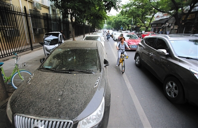 昨日,靈境胡同,機(jī)動車長時間停放車身已落滿灰塵,自行車道被占,騎車市民只能走機(jī)動車車道。新京報記者 王貴彬 攝