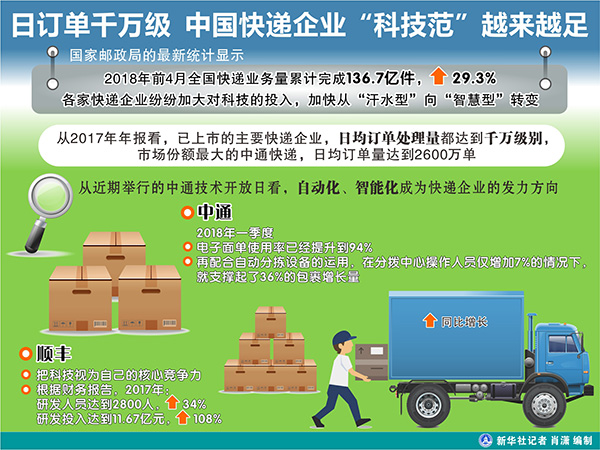 圖表:日訂單千萬級 中國快遞企業(yè)“科技范”越來越足 新華社記者 肖瀟 編制