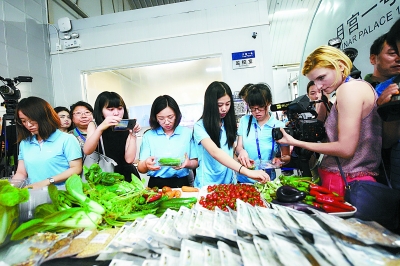 昨天(15日)上午,北京航空航天大學(xué)“月宮一號(hào)”實(shí)驗(yàn)室,為期365+5天的世界上時(shí)間最長(zhǎng)的“月宮365”實(shí)驗(yàn)獲得圓滿成功。左圖:4位志愿者從實(shí)驗(yàn)艙走出。上圖:從全密閉實(shí)驗(yàn)艙中帶出的蔬果吸引了眾人的目光。本報(bào)記者 和冠欣攝