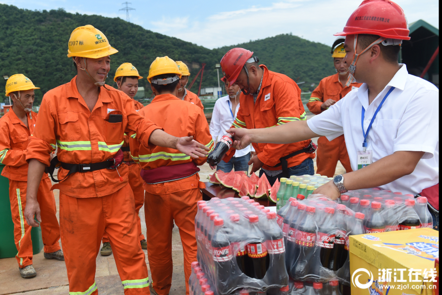 5月16日,杭州持續(xù)高溫,最高氣溫達(dá)37.5℃。在G25長(zhǎng)深高速德清至富陽段擴(kuò)容工地,工人正在抓緊建設(shè)跨富春江大橋。承建施工項(xiàng)目的浙江交工宏途交通建設(shè)有限公司,為一線建設(shè)者送來了清涼用品和防暑藥品,慰問高溫下作業(yè)的施工人員。(浙江在線記者 吳元峰 攝)