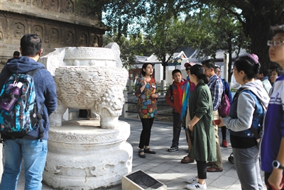 2017年10月,北京石刻藝術(shù)博物館館員在研究之余還免費為觀眾講解。據(jù)悉,新出臺的《博物館服務(wù)規(guī)范》對博物館講解服務(wù)作出規(guī)范,要求講解員講解時應(yīng)與觀眾互動交流,并解答觀眾問題。新京報記者 浦峰 攝