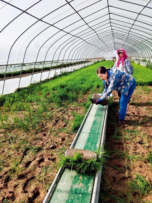 農(nóng)科大學(xué)生呂永杰在寧夏廣銀米業(yè)公司育苗基地移植水稻秧苗