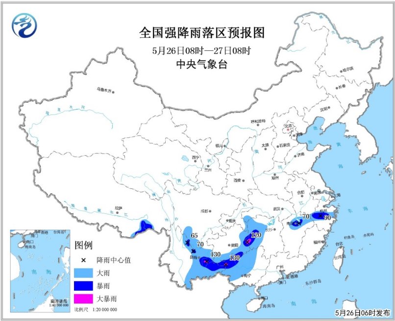 中央氣象臺預計,26日8時至27日8時,浙江中部、江西北部、湖南西部、貴州東部和南部、廣西中西部、云南東部和南部、四川南部等地的部分地區(qū)有大到暴雨,其中,湖南西南部、貴州東部、廣西西北部、云南東部局地有大暴雨(100~130毫米);上述部分地區(qū)并伴有短時強降水、雷暴大風等強對流天氣,最大小時降水量40~60毫米。中央氣象臺5月26日6時繼續(xù)發(fā)布暴雨黃色預警。