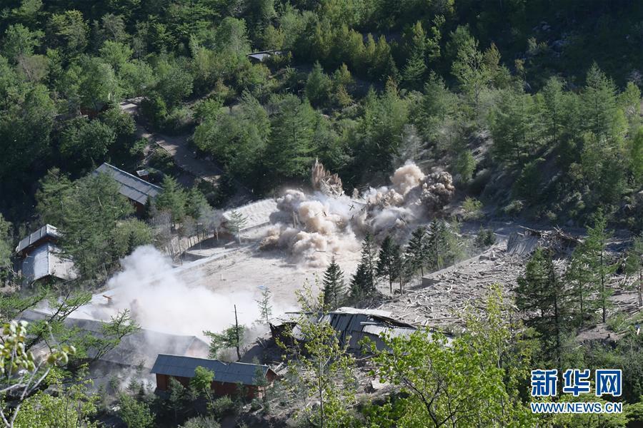這是5月24日在朝鮮咸鏡北道吉州郡的豐溪里核試驗(yàn)場拍攝的場內(nèi)地面建筑爆破場景。 新華社記者程大雨 攝