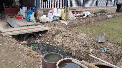 一個主打“土雞土菜”的農(nóng)家樂,餐廚廢水直接排到屋后的水渠,長年累月形成了黑色油膩的泥垢。記者 白田田 攝