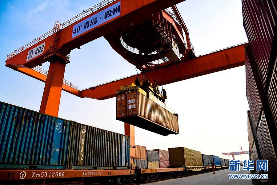 在青島膠州灣國際物流園,龍門塔吊在往中亞班列上裝載貨物(2018年5月7日攝)。該班列將通過阿拉山口至哈薩克斯坦的阿拉木圖。新華社記者 郭緒雷 攝