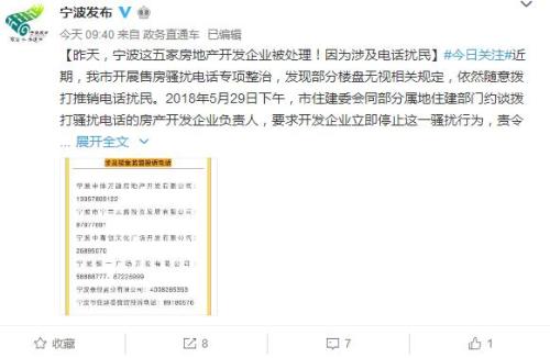 據(jù)寧波市政府新聞辦公室官方微博消息,5家房地產(chǎn)開發(fā)企業(yè)向?qū)幉ㄊ屑本戎行?20電話撥打推銷電話,寧波市住建委會同部分屬地住建部門,要求開發(fā)企業(yè)立即停止這一騷擾行為,責令其限期整改,并處以暫停網(wǎng)簽、延緩發(fā)放預售許可證等相關(guān)處罰措施。